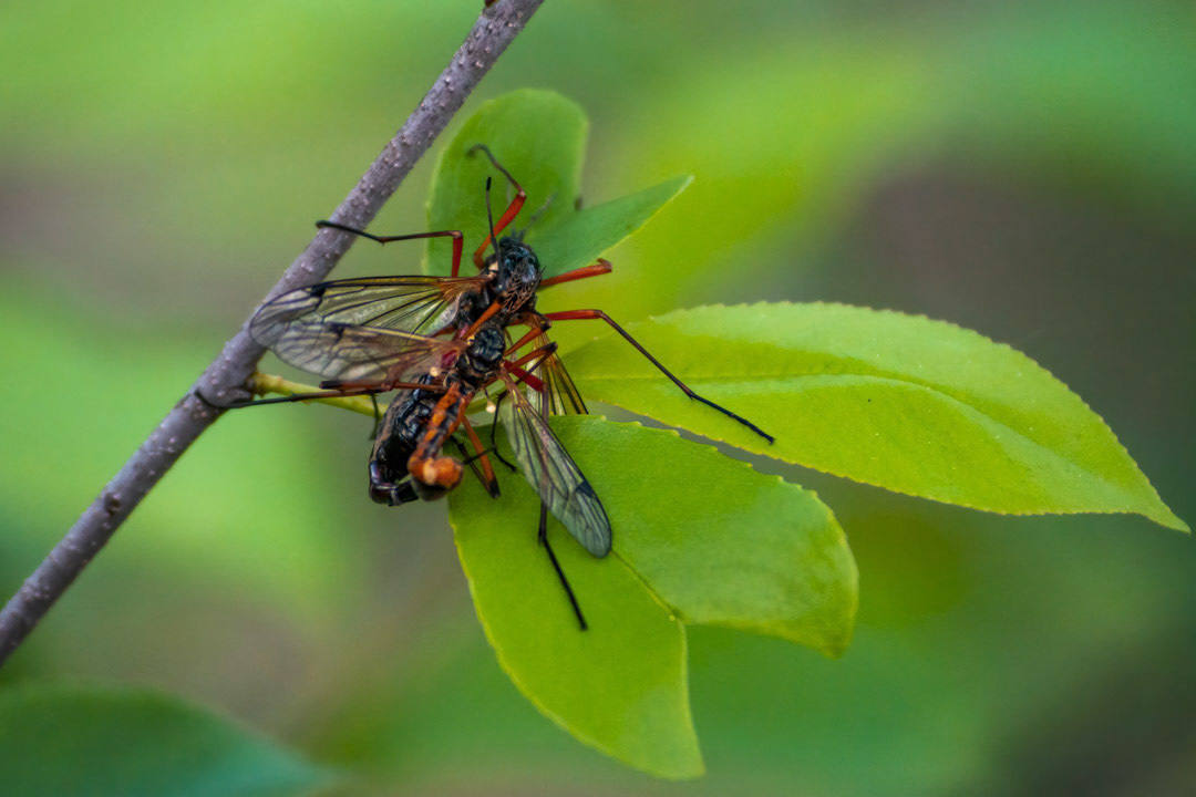 Blue dragonfly sitting on the nettle leaf. Blurred background.