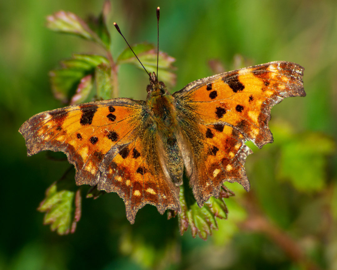 Ladybug resting on the leafs of the nettle. Blurred green background.