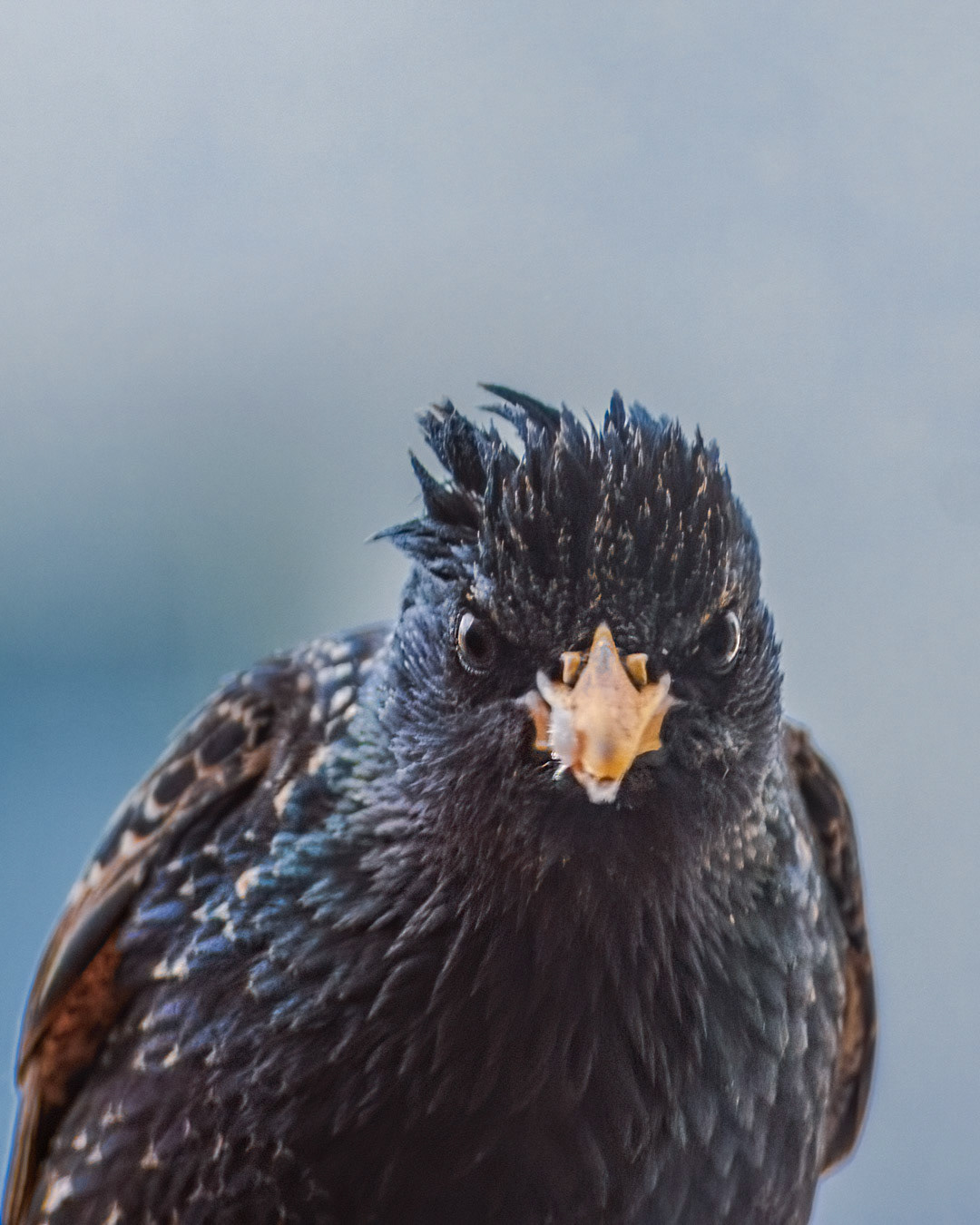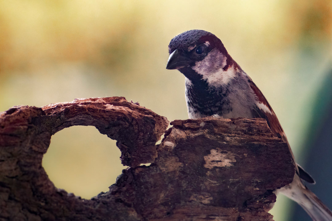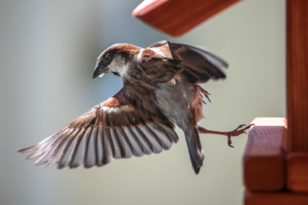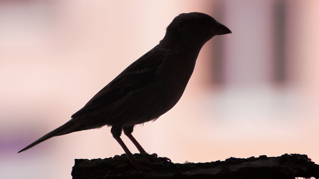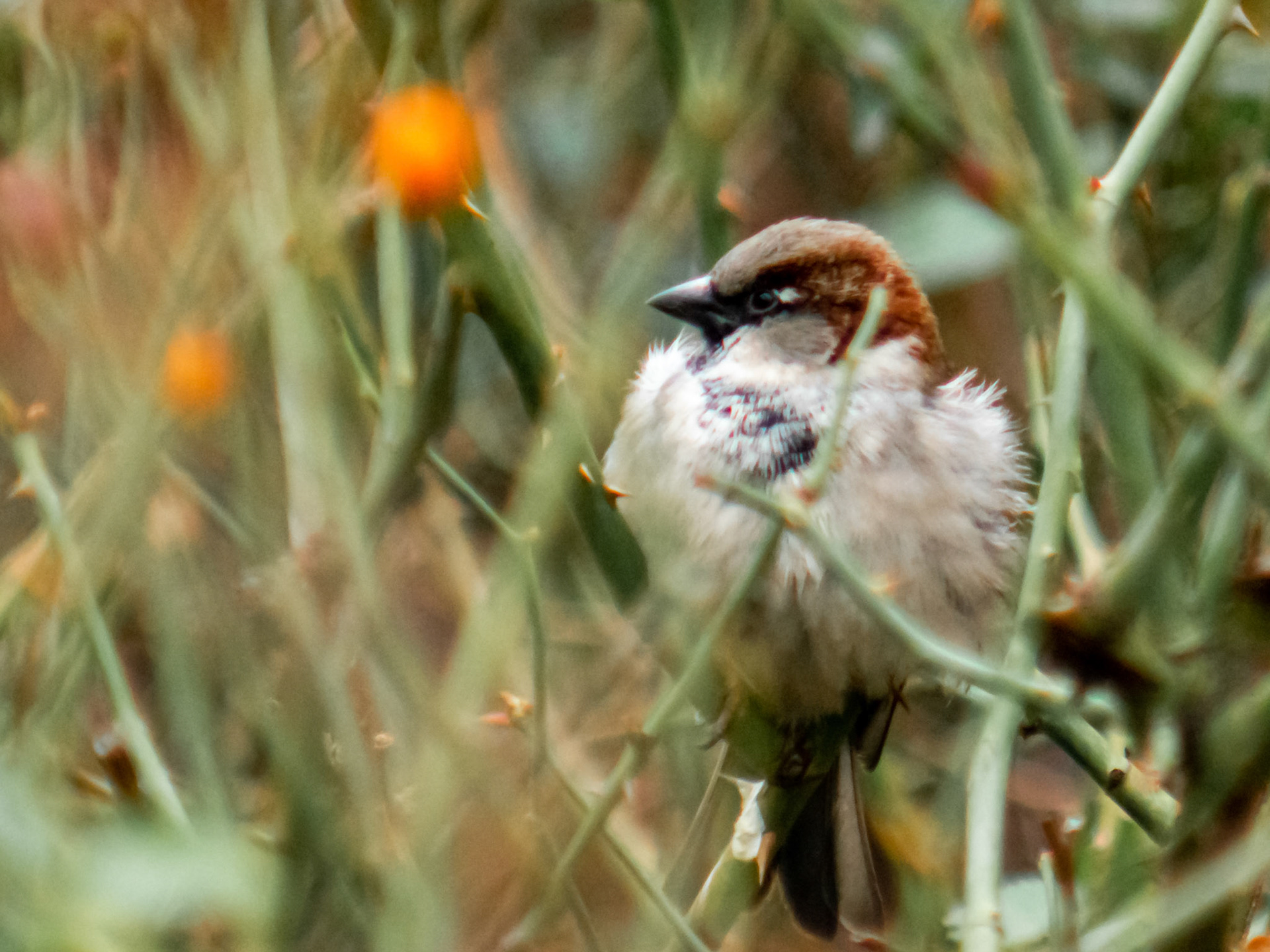 Male house sparrow (Passer domesticus) with puffed up feather is sitting on the balcony railing, watching over the neighborhood.