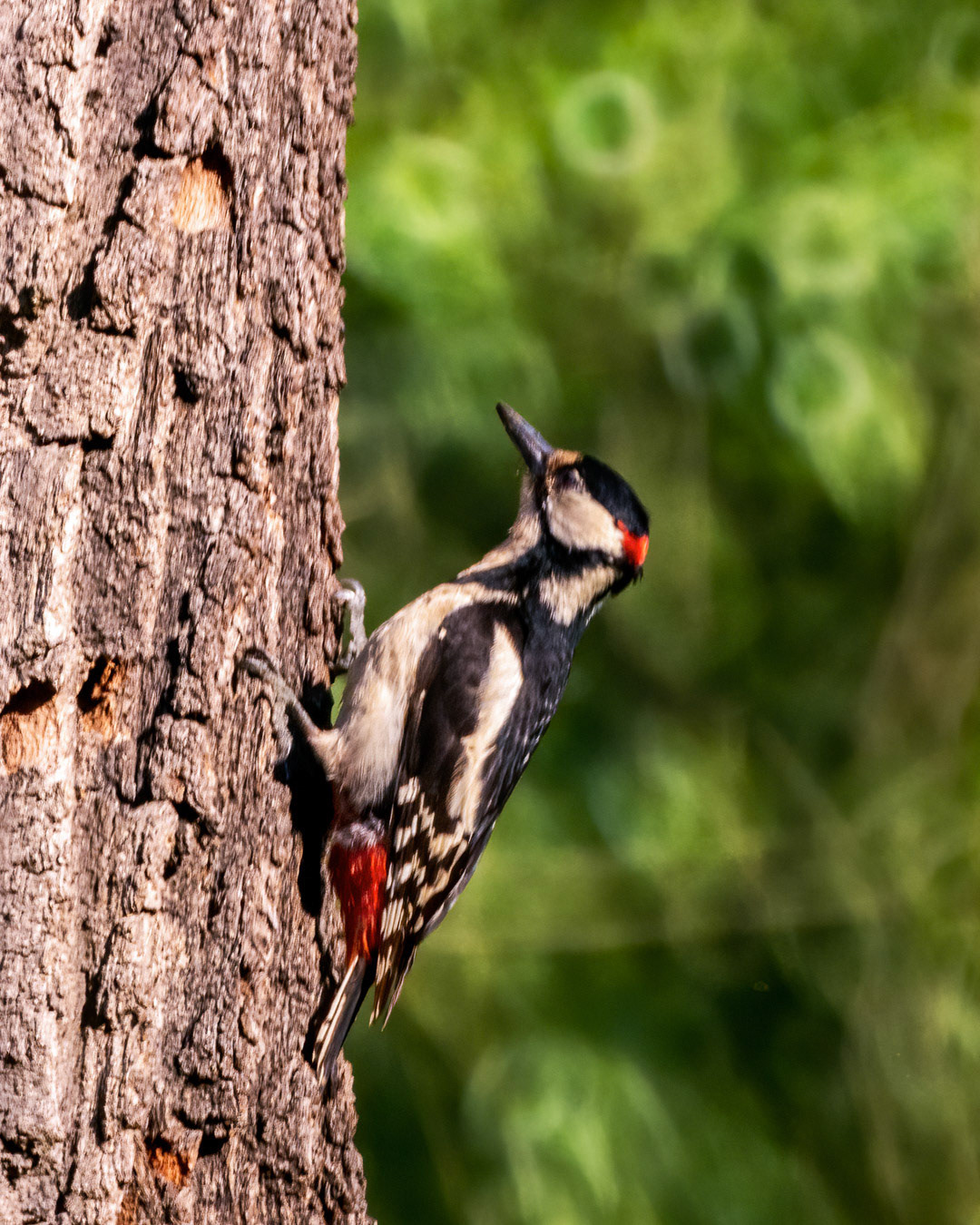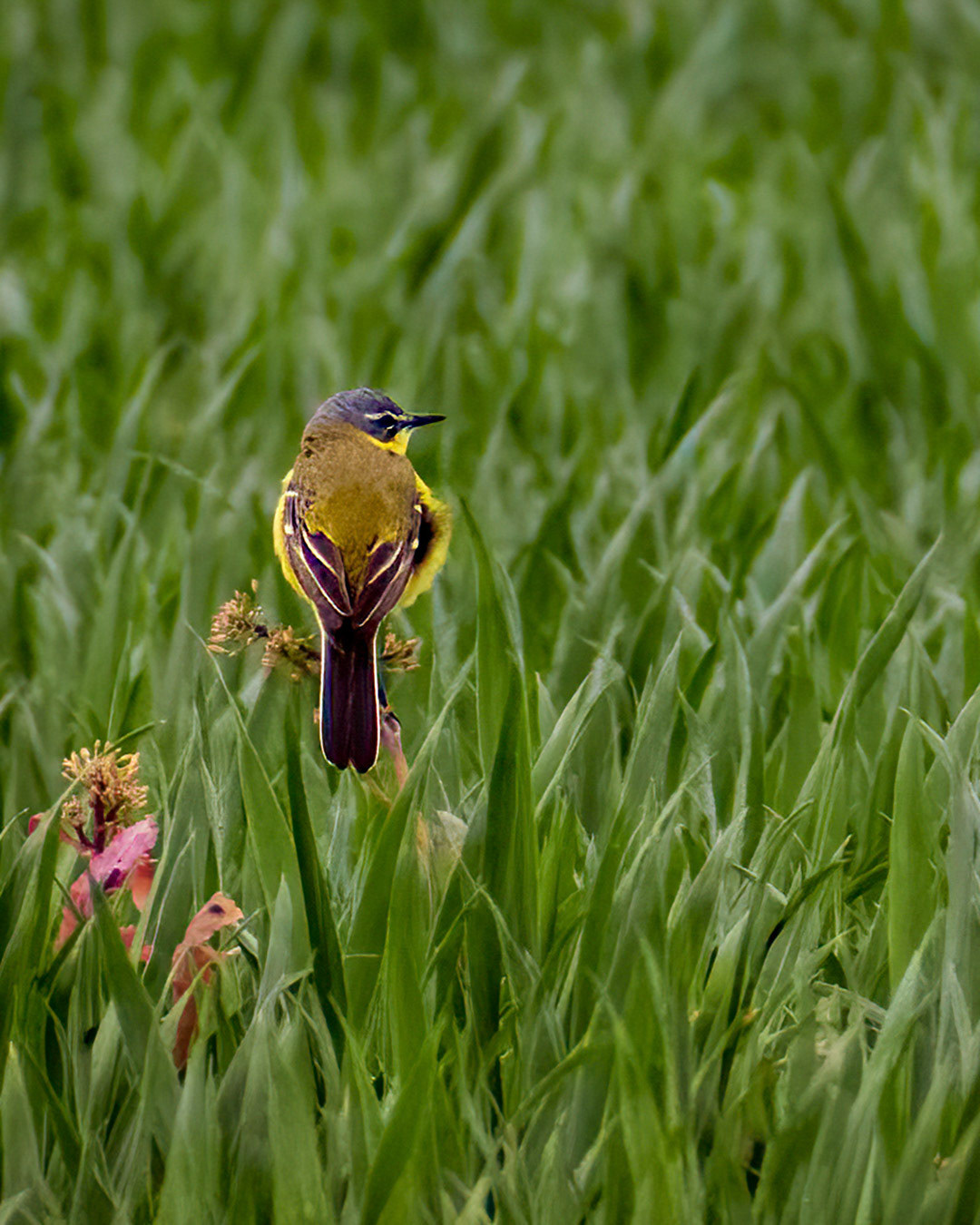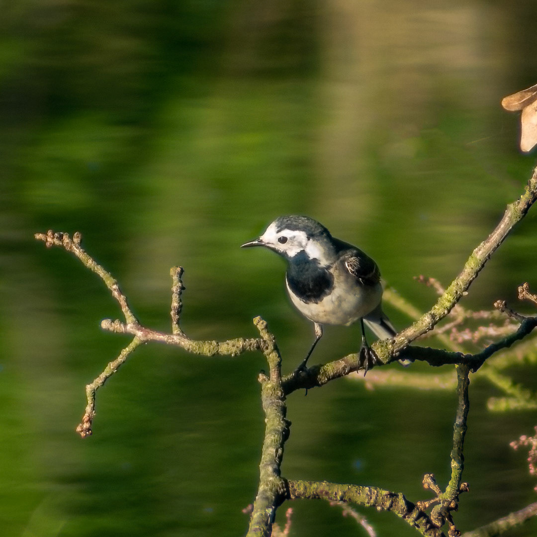 Side view of eurasian blue tit (Cyanistes caeruleus) sitting on the wooden branch with blurry background