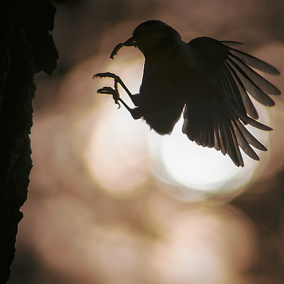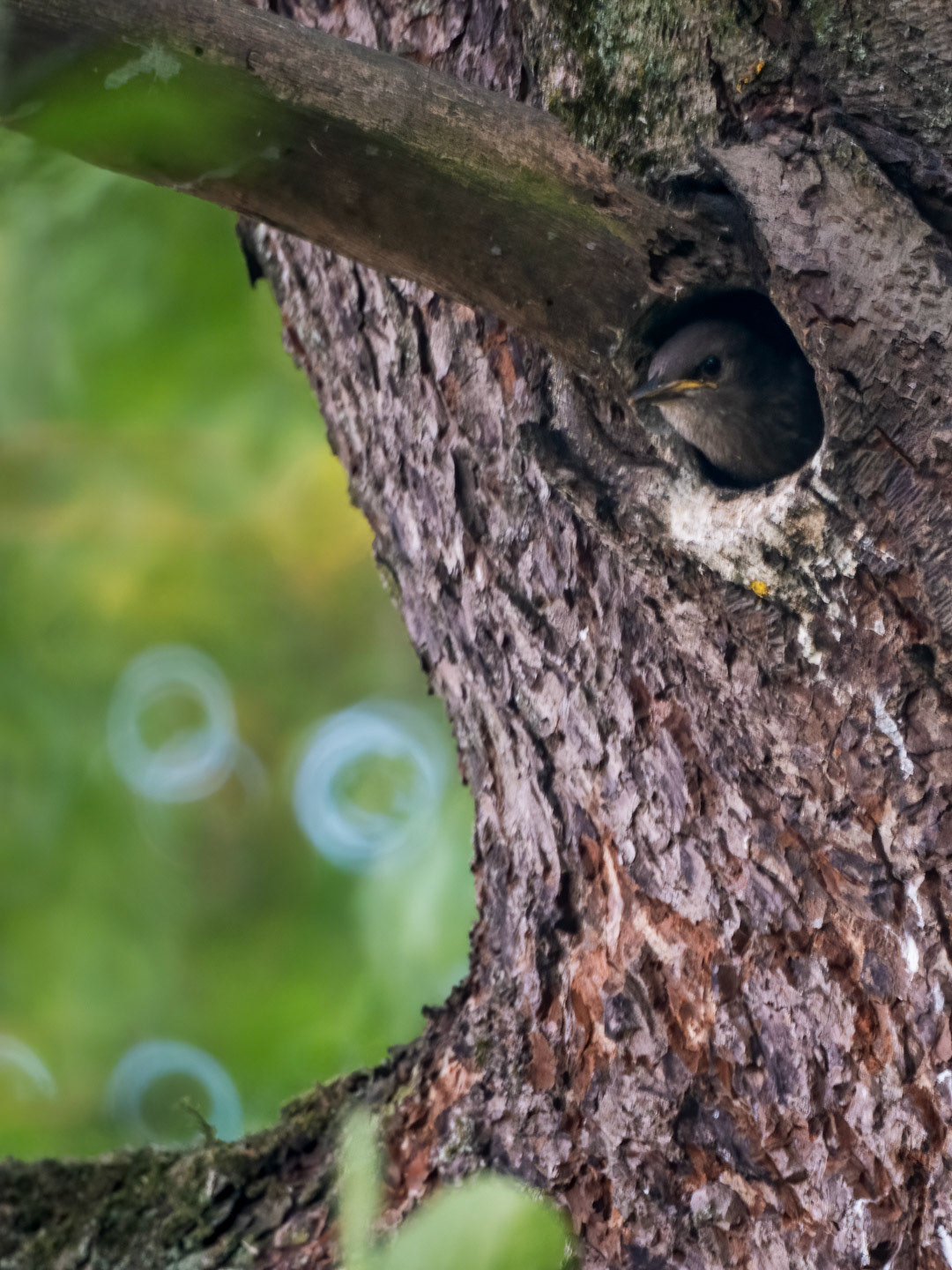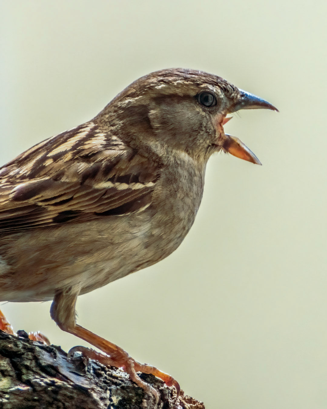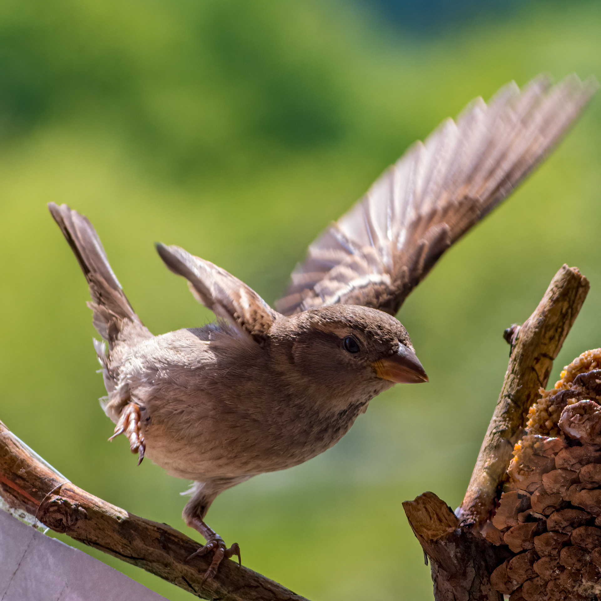 Male sparrow (Passer domesticus) is down from the branch. Tiny hair is sticking out of his mouth. Blurry background.