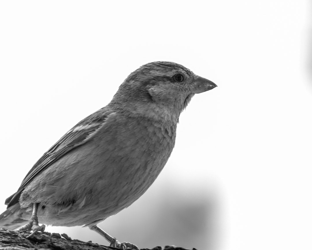 Juvenal female house sparrow (Passer domesticus) with puffed up feather is sitting on the balcony railing, watching over the neighborhood.